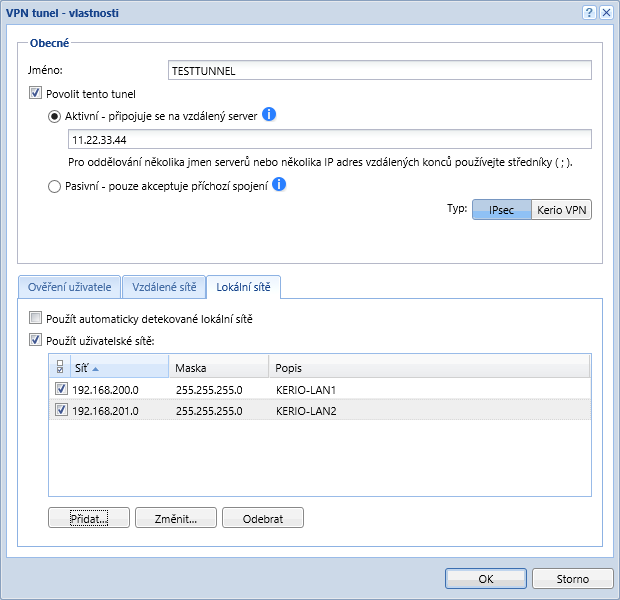 Dále už je potřeba jen vyplnit lokální a vzdálené sítě. Do vzdálených sítí zadáte lokální adresu sítě v Mikrotiku (například 192.168.100.0 s maskou 255.255.255.0) a do lokálních sítí zadáte lokální adresu sítě Keria (například 192.168.200.0 s maskou 255.255.255.0)